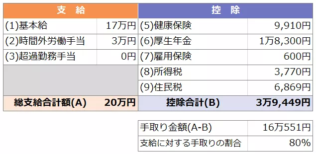 到手金額為=20萬円-(2萬8,942円+3,770円)=16萬7,288円