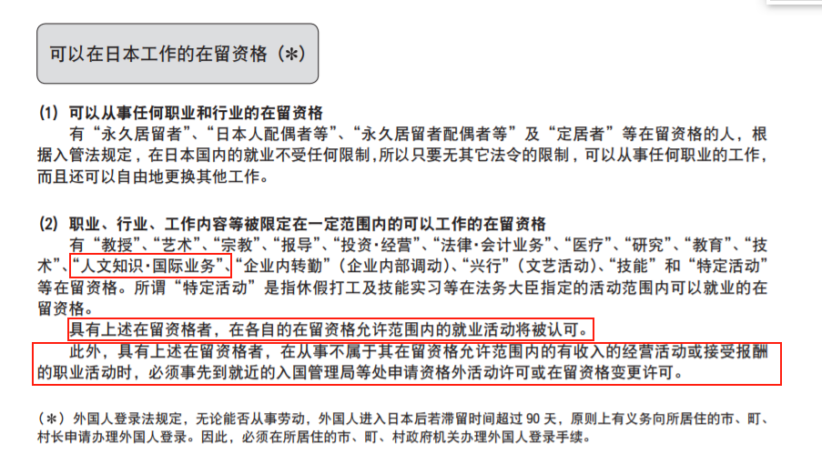 具有“人文知識?國際業務”在留資格者,在在留資格允許范圍內的就業活動將被認可。