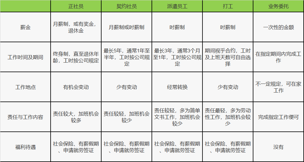 大致認識了日本各種雇用方式后,那麼比較一下其分別,好讓你更容易選出適合自己的工作。