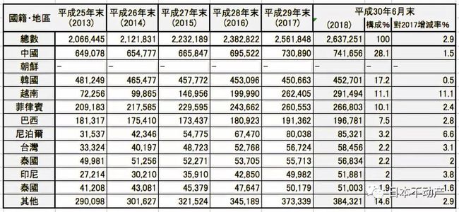 在下表中,讓我們解讀數據以了解居住在日本的外國人的在留資格和居住身份。以下有幾個關鍵的要點:在官方數據中,居住在日本的“外國人”的絕大多數人具有永久或長期居留身份,其中六成外國人是以下五大類:永住者丶特別永住者丶定住者丶家族滯在丶日本人的配偶者。“永住者”(eijyuusha丶えいじゅうしゃ)日本的永久居民(759,139人,占總數的28.8%)。擁有永住者資格(永住權)的外國人可以永久住在日本,在日本可以從事的活動(例如工作)與日本人相同丶不受簽證種類限制丶在留期間不需更新。因此可以更容易地申請日本銀行的貸款。“特別永住者“(tokubetsueijūsha丶とくべつえいじゅうしゃ)特別永久居民(326,190人,占總數的12.4%)。主要對象大多為在日朝鮮人?在日韓國人?在日臺灣人以及其子孫。歷史可以追朔到第二次世界大戰,來自日本殖民統治的殖民地(韓國或臺灣)的人民在當時雖然被視同日本國民并享有日本國籍,但隨著日本戰敗後,來自上述前殖民地的人民以及其子孫失去了日本國籍,為了使這些已定居在日本的人民得以繼續住在日本,給予其特別永住者身份。“定住者”(teijyuusha丶ていじゅうしゃ)長期居民(185,907人,占總數的7.0%)。主要對象為日系人(在日本以外國家有永久居民身份的日本人)及其配偶丶印尼難民丶喪失日本人或特別永住者配偶的外國人丶日本人的外國籍未婚子女等。與永住者一樣不受在日本可以從事的活動(例如工作)與日本人相同丶不受簽證種類限制。但是在留期間必須更新,大多為一年或三年。約五分之一的外國人在日本念書或實習。留學生(在留資格為“留學”)共324,245人,占總數的12.3%。實習生(在留資格為“技能實習”)人共285,776人,占總數的10.8%。這兩個類別共占日本外國人總數的五分之一。在日本工作的外國人最多的在留資格是(按在留資格的百分比計算)是“技術?人文知識?國際業務“。持有此類的在留資格者被定義為“具備法學丶經濟學丶社會學或其他人文科學領域相關知識,并從事與上述知識相關領域的活動或工作”。從事這些活動必須基於與日本公家機關或民間企業之間的工作合約,包括:例如:口譯丶翻譯丶企劃文案丶時裝設計丶室內設計丶銷售丶海外業務,資訊處理丶國際金融丶設計或公共關系以及廣告等。值得注意的是,為了緩減日本人才不足的情況和吸引更多擁有高度專門技能人材,日本政府新增設了以下三類在留資格:2015年新增“高度專門職”(高度人才簽證)丶2017年新增“介護”以及“技能實習3號イ?ロ”。因此,此三類在留資格於2018年6月末對照2017年年末,有超過20%的大幅增長率。此三項在留資格的在留期間最長可達到5年。其中,“高度專門職”(高度人才簽證)由於「學歷」丶「職務經歷」丶「年収」累積積分達70分即可申請,并且可享較多的優惠制度(例如:工作累積1年或3年即可申請成為永住者),因此許多原本持“技術?人文知識?國際業務“的外國人也在此在留資格實施後陸續變更在留資格。
