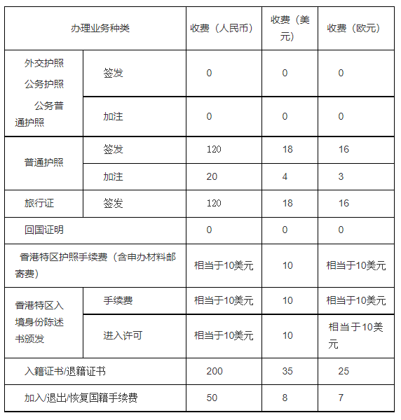 注:上述費(fèi)用除香港特區(qū)護(hù)照申請和入境身份陳述書以美元為標(biāo)準(zhǔn)外,其余均以人民幣為標(biāo)準(zhǔn)換算成等量當(dāng)?shù)刎泿拧?/p>