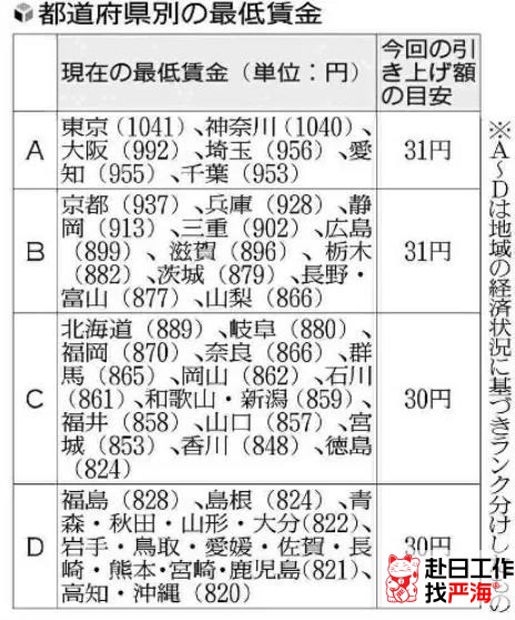 東京都的最低時薪,從原來的1041日元調整到1072日元,其他地區都有不同程度的調整。