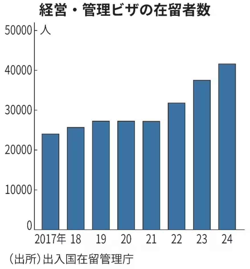 2014年,日本修改了《入管法》,將先前的“投資者/管理”簽證改為“經營管理”簽證,目的是鼓勵外國人在日本創業,振興經濟,實現技術和服務的多樣化。到2024年,持經營簽證在日本居留的外國人數將達到約4.1萬人,比五年前增加50%。